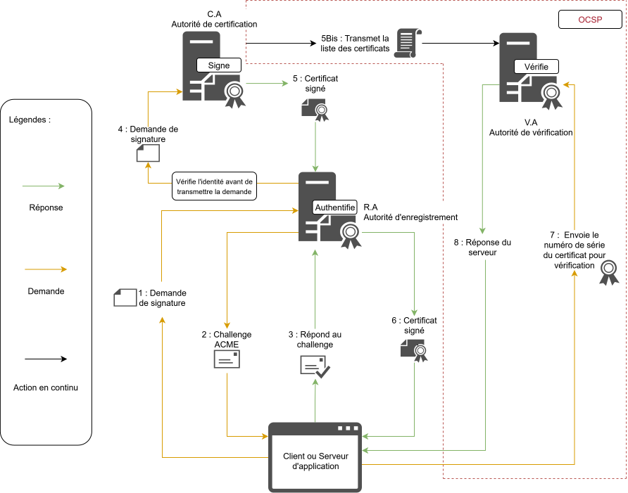 Libellum permet d’assurer tout le cycle de vie des clefs de sécurité au sein de votre infrastructure depuis la création des clefs, de leur stockage sécurisé par un module de sécurité matériel (i.e. Hardware Security Module – HSM) de confiance, leur déploiement sécurisé et leur validation via les protocoles ACME et OCSP.